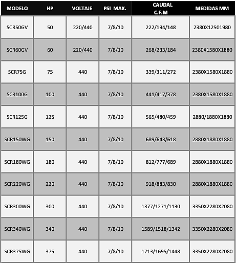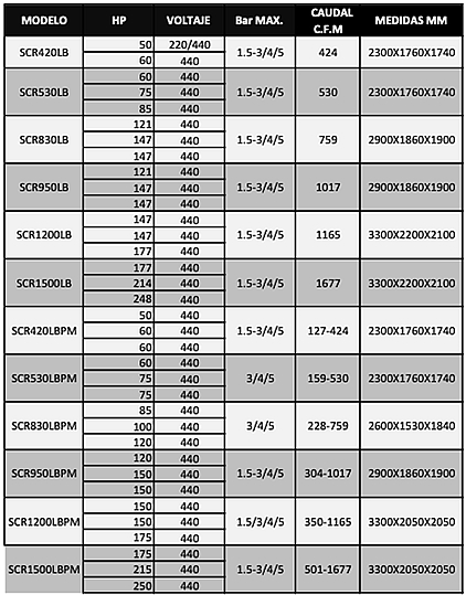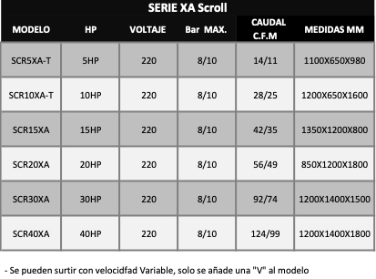 Contamos con dos tipos de unidades para suministrar Aire comprimido Libre de Aceite: Mediante Tornillo Rotativo en dos etapas, para capacidades de 50 Hp y hasta 375 Hp, o bien tipo Scroll, que se provee en capacidades desde 5 Hp hasta 40 Hp